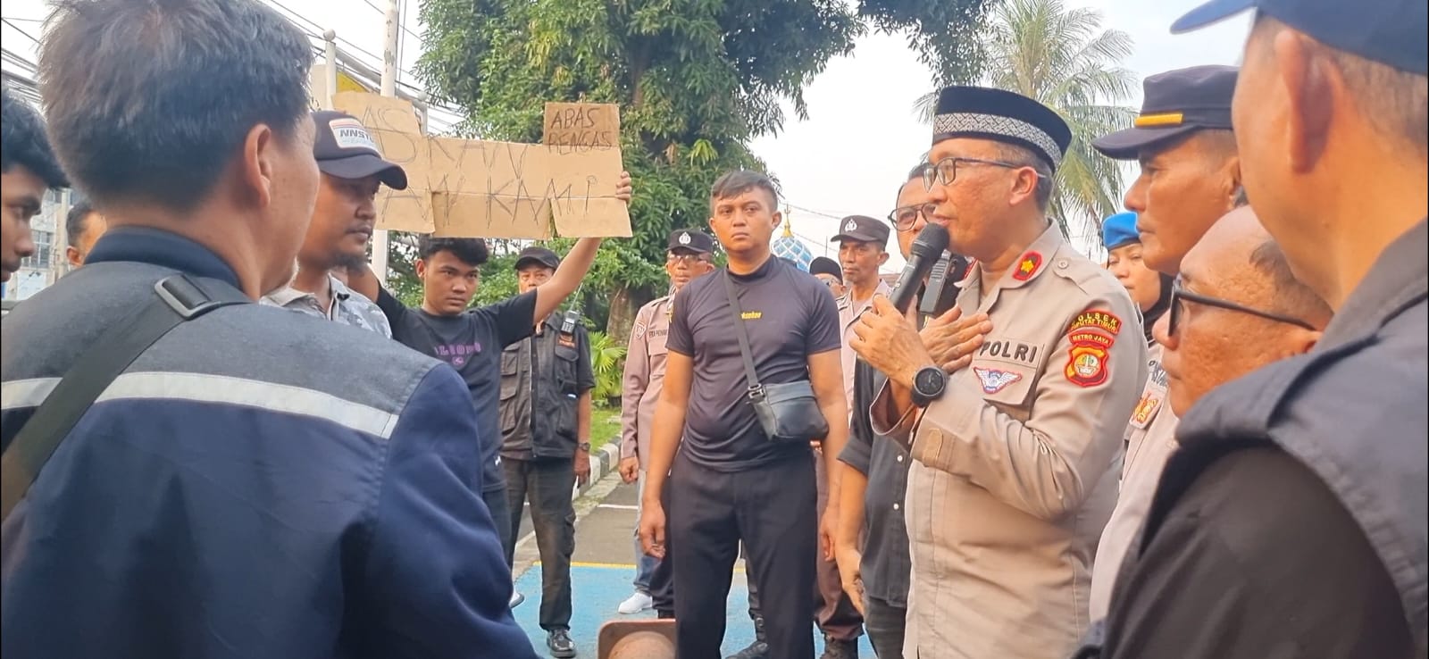 Kapolsek Ciputat Timur, Komisaris Polisi Bambang Askar Sodiq, turun langsung ke lokasi. Dengan sikap tegas namun tetap humanis, ia memberikan imbauan serta penjelasan hukum kepada massa.